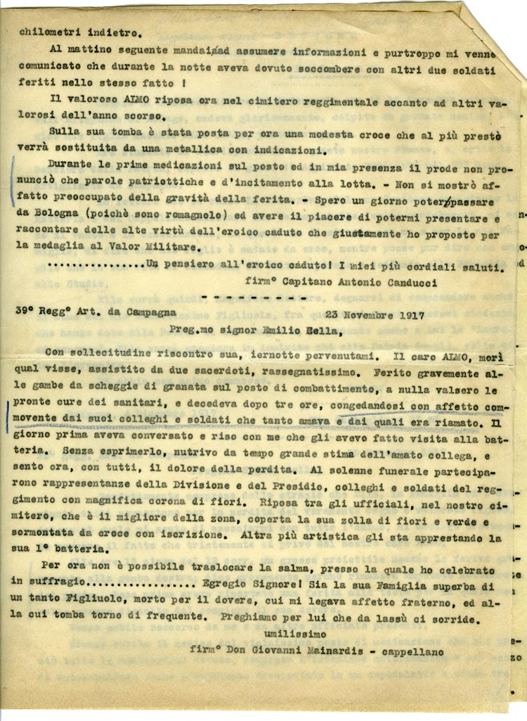 Lettera dattiloscritta del padre di Almo Cella con cui si comunica la morte del figlio.