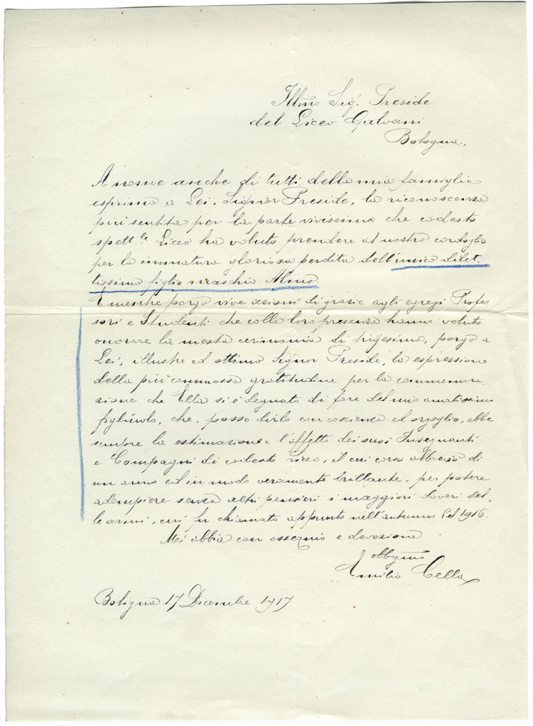 Lettera manoscritta del padre di Almo Cella al preside per la partecipazione al dolore della famiglia. 17 dicembre 1917 |