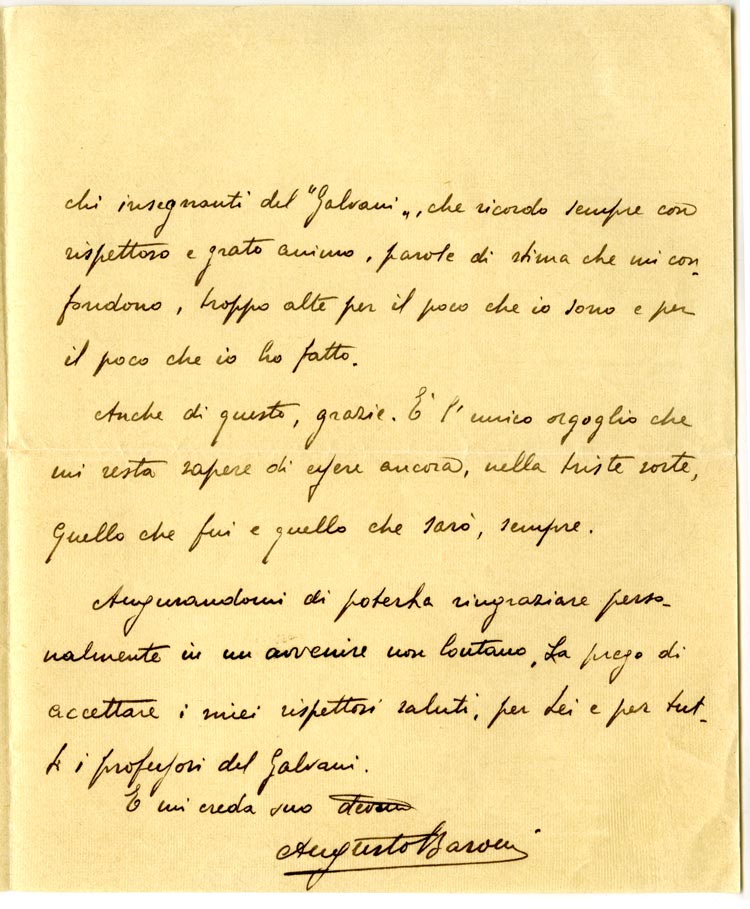 Lettera (copia) del preside Belletti allo studente Augusto Baroni in risposta ad una cartolina ricevuta.