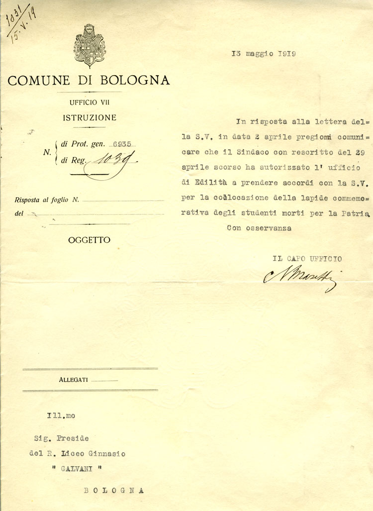 Comunicazione del Comune di Bologna al preside Belletti per la collocazione della lapide comemorativa degli studenti caduti.